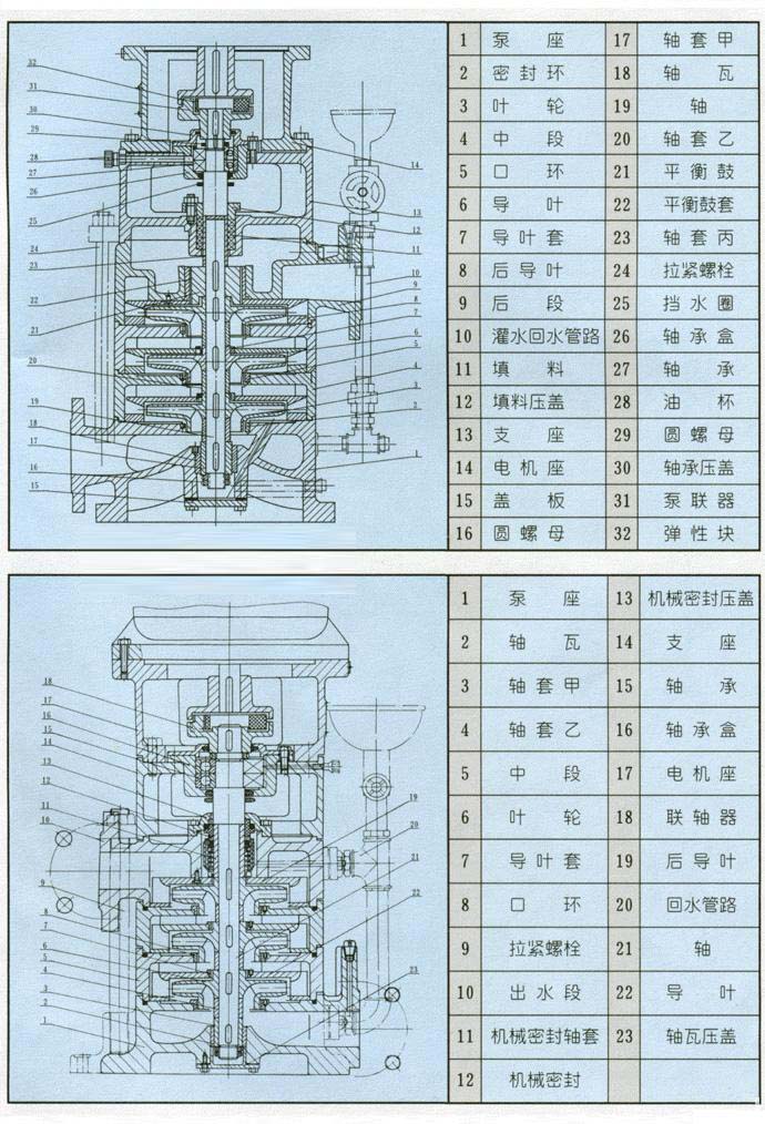 1、本系列泵為立式、多級、節(jié)段式結(jié)構(gòu),用螺栓把進(jìn)水段、中段、出水段緊固成一體,泵每級裝一個葉輪及導(dǎo)葉,其軸向力采用水力平衡,殘余軸向力由一個或一對球軸承承受;