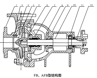 AFB型不銹鋼耐腐蝕離心泵是在FB型耐腐蝕泵的基礎(chǔ)上改進(jìn)設(shè)計的,均采用新型的付葉輪動力軸封裝置,采用先進(jìn)水力模型,新穎結(jié)構(gòu)與高強(qiáng)度組合式雙端面機(jī) 械密封,具有高次節(jié)能、結(jié)構(gòu)緊湊、性能穩(wěn)定、使用可靠等優(yōu)點。屬單級單吸懸臂式耐腐蝕離心泵。該泵與輸送介質(zhì)接觸的過流部份零件,均采用 1Cr18Ni9Ti材料制造。用于輸送不含固體顆粒,有腐蝕性液體,被輸送介質(zhì)溫度為-20℃~120℃,泵進(jìn)口壓力不大于2kg/cm2。采用雙端面 密封冷卻裝置可輸送300℃左右的高溫介質(zhì)。