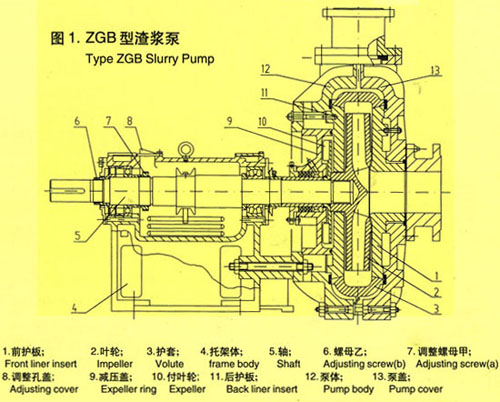 ZGB系列渣漿泵為雙泵殼結(jié)構(gòu),即泵體、泵蓋帶有可更換的耐磨金屬內(nèi)襯(包括葉輪、護(hù)套、護(hù)板等)。泵體、泵蓋根據(jù)工作壓力采用灰鑄鐵或墨鑄鐵鑄造。該系列泵均為垂直中開式,泵體有止口與托架用螺栓聯(lián)接。泵的吐出口方向可按45度間隔八個角度旋轉(zhuǎn)安裝。葉輪前后蓋板設(shè)有背葉片以減少泄漏及提高泵的使用壽命。該系列泵進(jìn)口為水平方向,從傳動方向看泵為順時針方向旋轉(zhuǎn)。起動及使用時嚴(yán)禁電機(jī)反方向旋轉(zhuǎn),否則,將葉輪脫落造成事故。