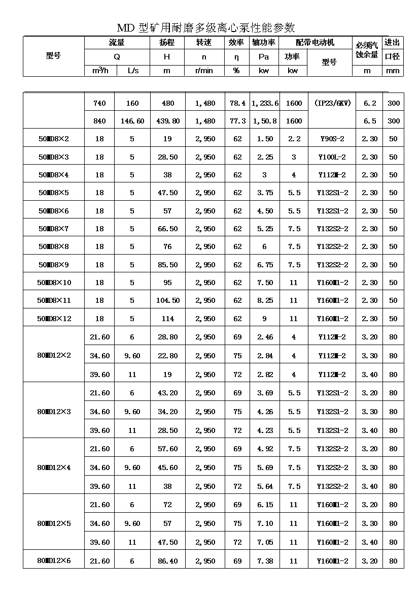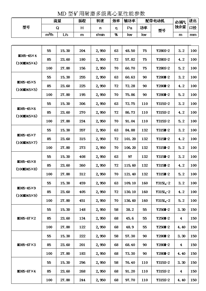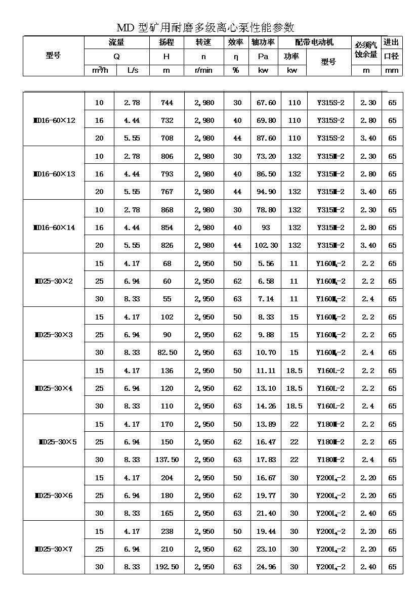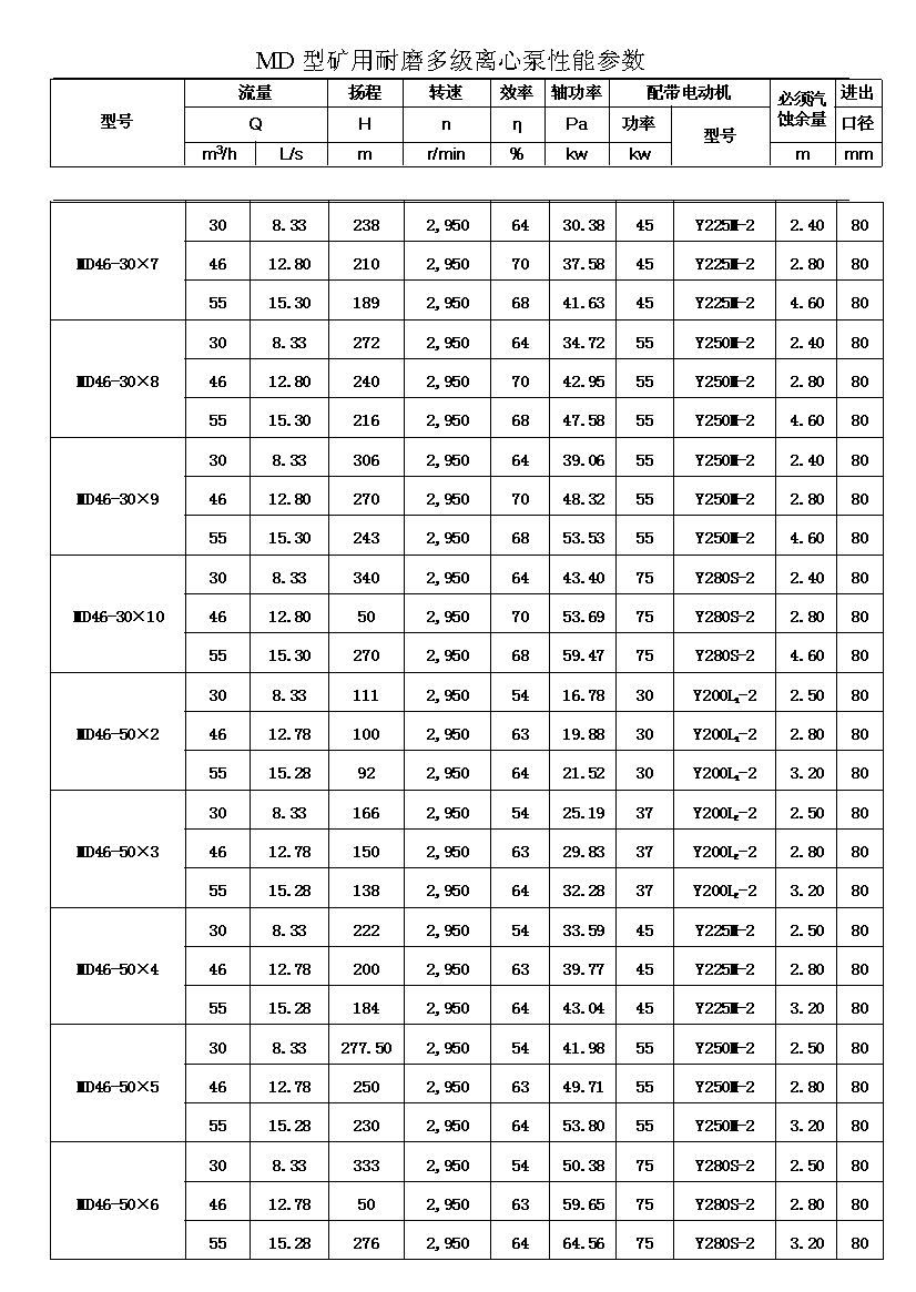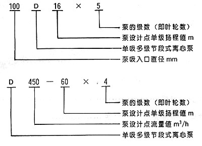 注:D(DF多級耐腐蝕離心泵、DY多級離心油泵、MD多級耐磨離心泵)80-30為習慣表示方法,其中80表示泵吸入口直徑為80mm,30表示泵設(shè)計點單級揚程為30m,其它含義與上述表示方法相同。