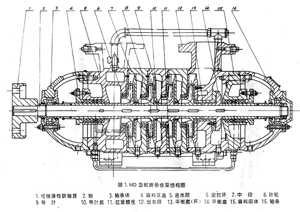 MD系列泵系臥式、單吸、分段式多級離心泵,吸入口為水平方向,吐出口與水平垂直向上。泵的進水段、中段、出水段、軸承體待泵殼體部分通過拉緊螺栓聯(lián)成一體,并根據(jù)泵的揚程選擇泵的級數(shù)。