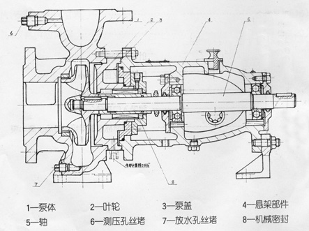 該系列泵為后開門結(jié)構(gòu),其優(yōu)點是轉(zhuǎn)子部件檢修或更換無須拆卸管道,轉(zhuǎn)子部件由懸架支撐哲(請參考ISR泵結(jié)構(gòu)圖)。