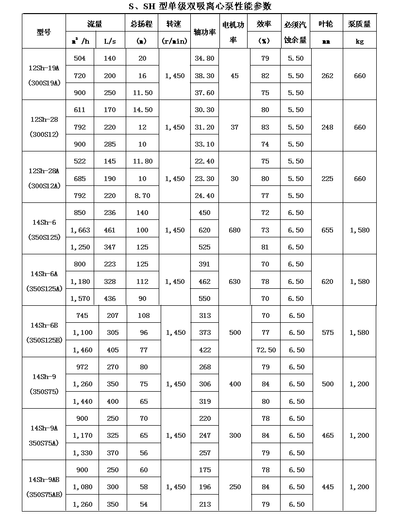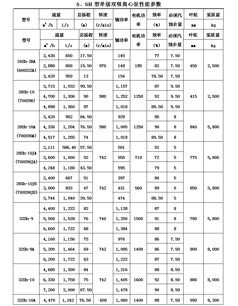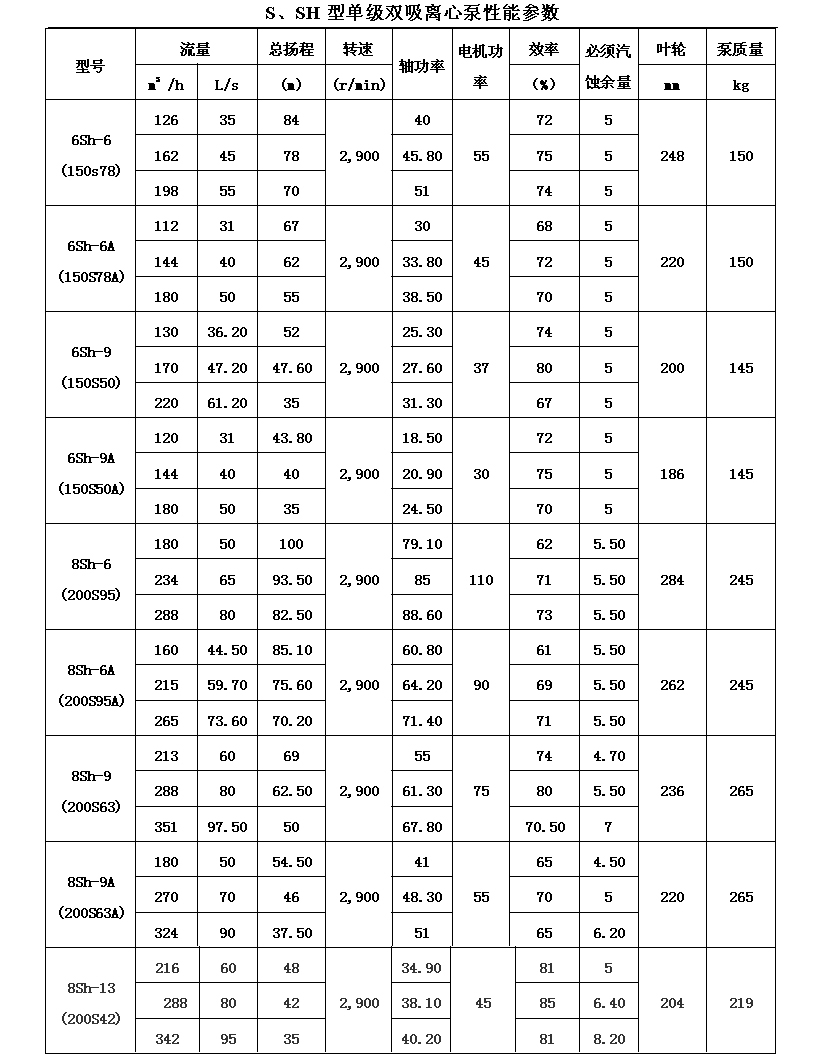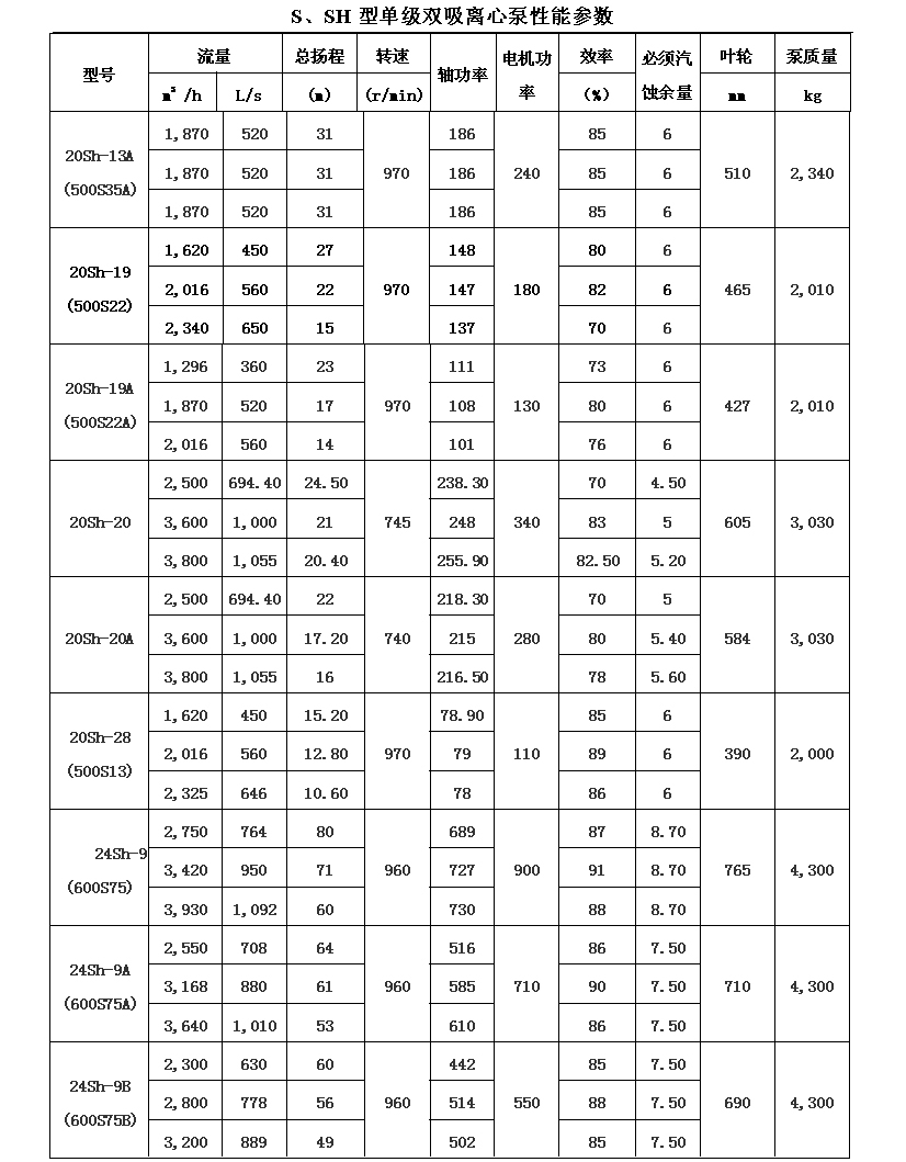 吸離心泵、S,SH型單級雙吸泵殼中開之離心泵,供抽送清水或物理化學(xué)類似于水的其它液體之用。被輸送液體溫度不得高于80℃。